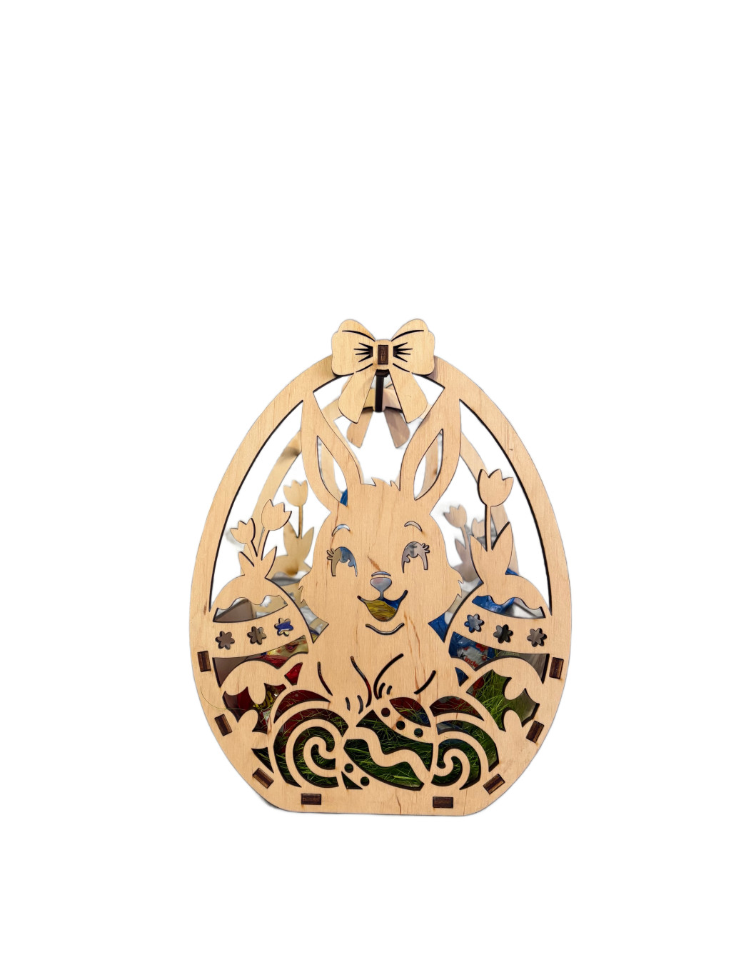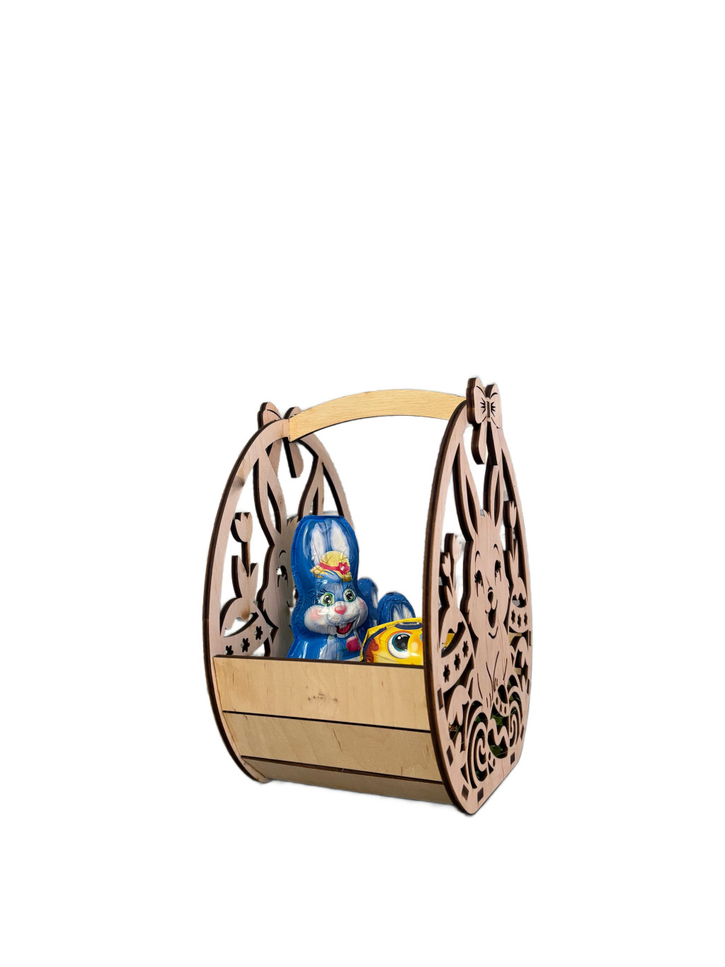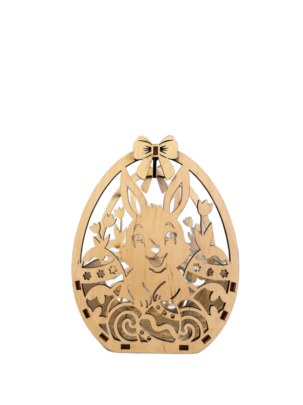 Különleges, lézervágott fa húsvéti kosár aranyos nyuszi mintával. Tökéletes választás húsvéti édességek, apró ajándékok vagy tojások tárolására.