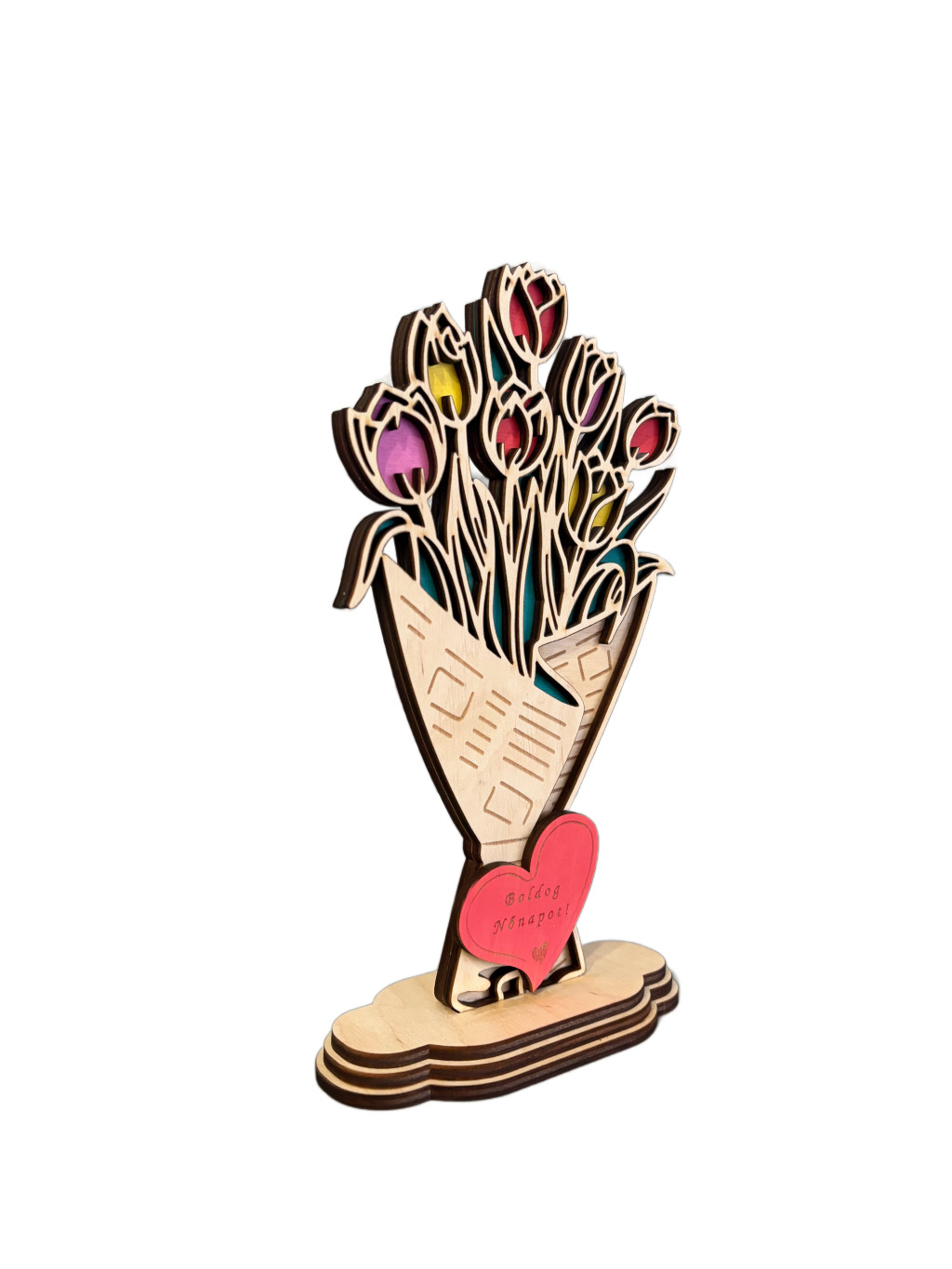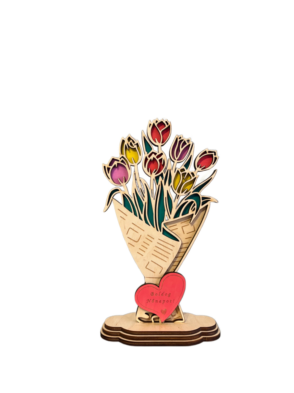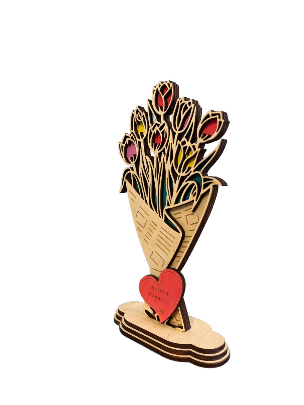 Kézzel festett, lézervágott tulipáncsokor tartós nyírfából. Tökéletes ajándék nőnapra, anyák napjára, születésnapra vagy bármilyen különleges alkalomra. amely örök emlék marad.